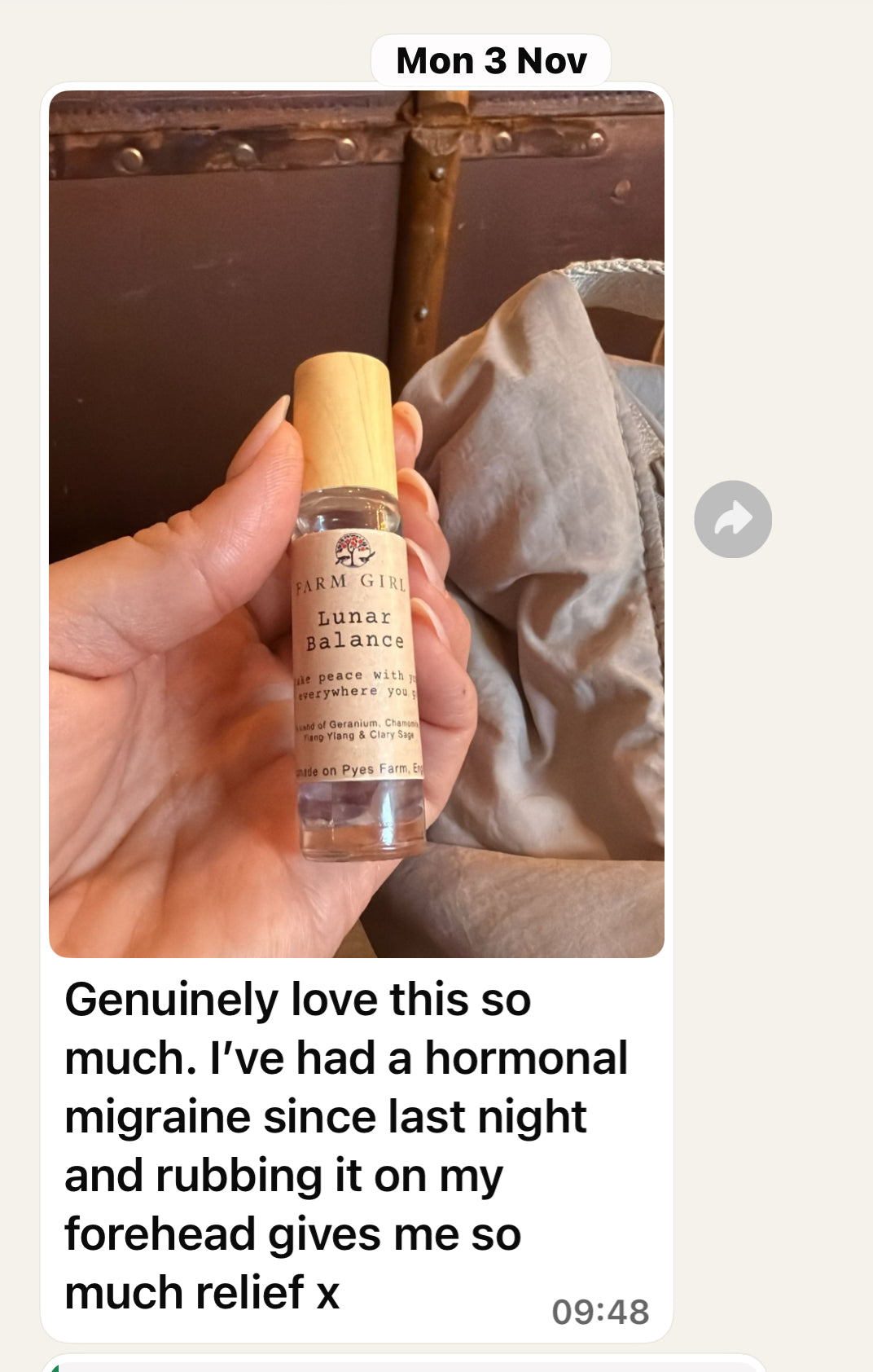 The essential oils in our Lunar Balance blend — Geranium, Ylang Ylang, Clary Sage, Lavender and Roman Chamomile — were chosen for their ability to support women’s hormonal rhythms, emotional regulation and nervous-system balance. Rolled onto pulse points, the aroma helps the body shift into a calmer, steadier state.
